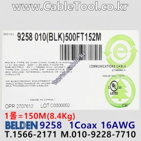 벨덴케이블 BELDEN 9258, 150m, 1Coax 16AWG, RG8X, 50 Ohm Wireless Transmission Coax, UL 1354, UL1685 UL Loading