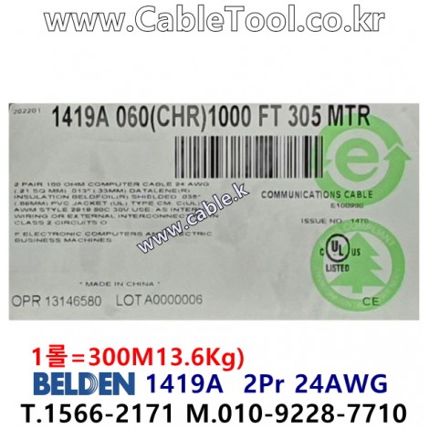 벨덴케이블 1419A BELDEN (300m) > 벨덴케이블 RS422 카다로그 바로가기: http://www.Cable.kr
