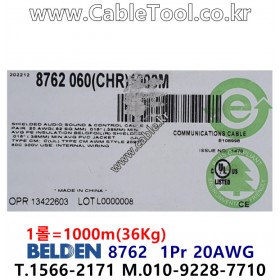 벨덴케이블 BELDEN 8762, 1000m, 1Pair 20AWG, UL AWM 2092, 오디오, 제어 & 계장용 케이블